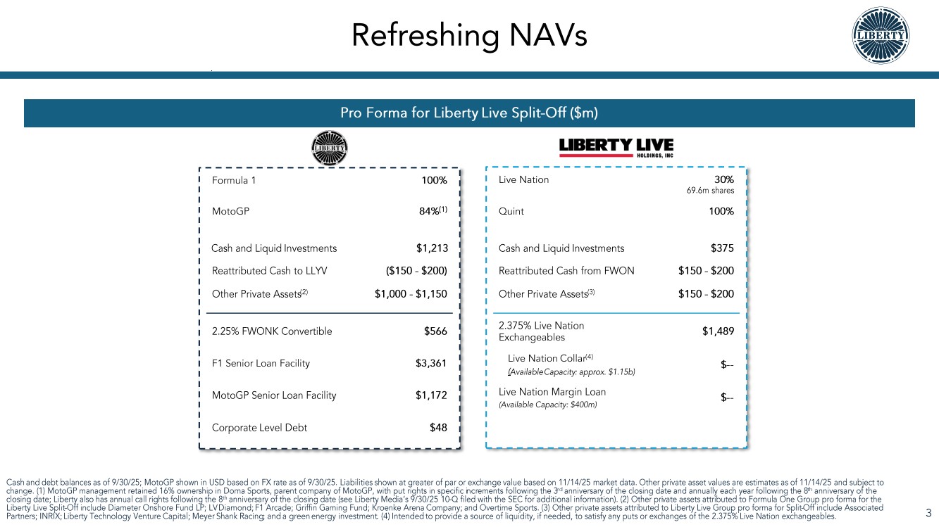This presentation includes certain forward-looking statements within the meaning of the Private Securities Litigation Reform Act of 1995, including the completion of the proposed split-off of the Liberty Live Group (the “Split-Off”) (including the allocation of assets and liabilities and the expected benefits of the Split-Off) and other matters related to the Split-Off. All statements other than statements of historical fact are “forward-looking statements” for purposes of federal and state securities laws. These forward-looking statements generally can be identified by phrases such as “possible,” “potential,” “intends” or “expects” or other words or phrases of similar import or future or conditional verbs such as “will,” “may,” “might,” “should,” “would,” “could,” or similar variations. These forward-looking statements involve many risks and uncertainties that could cause actual results and the timing of events to differ materially from those expressed or implied by such statements, including, without limitation, the satisfaction of conditions to the Split-Off and the Split-Off may not be consummated. These forward-looking statements speak only as of the date of this presentation, and Liberty Media expressly disclaims any obligation or undertaking to disseminate any updates or revisions to any forward-looking statement contained herein to reflect any change in Liberty Media’s expectations with regard thereto or any change in events, conditions or circumstances on which any such statement is based. Please refer to the publicly filed documents of Liberty Media, including its most recent Forms 10-K and 10-Q, as such risk factors may be amended, supplemented or superseded from time to time by other reports Liberty Media subsequently files with the SEC, for additional information about Liberty Media and about the risks and uncertainties related to Liberty Media’s businesses which may affect the statements made in this presentation.